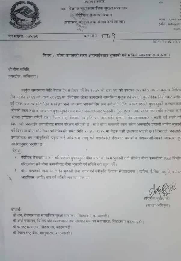 वैदेशिक रोजगार विभागले बीमा समितिलाई पत्र पठाउँदै विदेशमा रहेका कामदारले सम्बन्धित मुलुक हेर्ने नेपाली कूटनीतिक नियोगबाट बढीमा दुई पटक श्रम स्वीकृति लिन सक्ने व्यवस्था भएबमोजिम श्रम स्वीकृति लिँदा कामदारहरुले बुझाउनुपर्ने कल्याणकारी कोषको रकम तथा बीमाबापत बुझाउनुपर्ने रकम अनलाइनबाट भुक्तानी गर्नुपर्ने उल्लेख छ ।