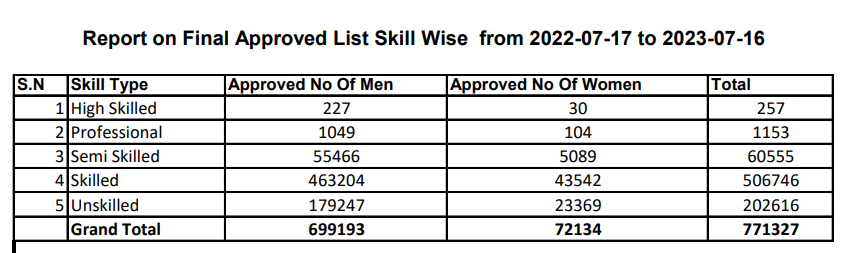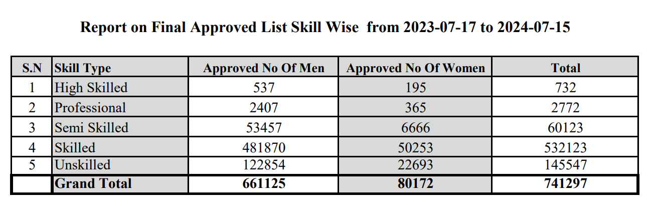 वैदेशिक रोजगारीको श्रम स्वीकृति लिएका ८० हजार १७२ महिलामध्ये उच्च दक्ष, व्यावसायिक, अर्धदक्ष र दक्षसमेत गरी कुनै न कुनै दक्षता भएका ५७ हजार ४७९ महिला छन्। यसैगरी कुल ६ लाख ६१ हजार १२५ पुरुष श्रमिकले श्रम स्वीकृति लिएकोमा ५ लाख ३८ हजार २७१ जना कुनै न कुनै दक्षता हासिल गरेका श्रमिक हुन्।