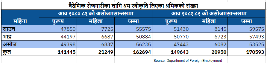 श्रमिकको संख्या गत आर्थिक वर्षको साउन र भदौको तुलनामा चालु आर्थिक वर्षको सोही महिनाहरुमा श्रम स्वीकृति लिनेको संख्या बढे पनि असोज महिनामा गिरावट देखिएको छ। विभागका अनुसार गत वर्ष असोजमा कुल ५६ हजार २३५ जनाले श्रम स्वीकृति लिएका थिए। चालु आर्थिक वर्षको असोज महिनामा ५३ हजार ५२५ जनाले स्वीकृति लिएका छन्।