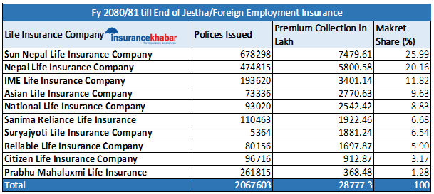 यसैगरी जेठसम्म वैदेशिक रोजगार बीमालेखबाट एसियन लाइफले २७ करोड ७० लाख रुपैयाँ, नेसनल लाइफले २५ करोड ४२ लाख रुपैयाँ, सानिमा रिलायन्स लाइफले १९ करोड २२ लाख रुपैयाँ, सूर्यज्योति लाइफले १८ करोड ८१ लाख रुपैयाँ र रिलायबल नेपाल लाइफले १६ करोड ९७ लाख रुपैयाँ कुल बीमाशुल्क आर्जन गरेका छन्।
