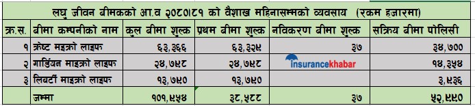 यसैगरी वैशाखसम्म गार्डियन माइक्रो लाइफले २ करोड ४७ लाख ९८ हजार रुपैयाँ र लिबर्टी माइक्रो लाइफले १ करोड ३७ लाख ९० हजार रुपैयाँ कुल बीमाशुल्क आर्जन गरेका छन्।