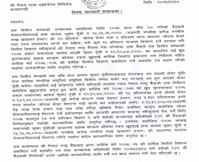 कम्पनीले यसअघि २० प्रतिशत बोनस र ६ प्रतिशत नगद लाभांश प्रस्ताव गरेको थियो । उक्त लाभांश परिमार्जन गरी संस्थाले २५ प्रतिशत बोनस र १ दशमलव ३१६ प्रतिशत नगद लाभांश प्रस्ताव गरेको छ ।