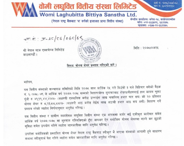 वोमी लघुवित्त र ग्रामीण स्वयंसेवक लघुवित्त वित्तीय संस्था एक आपसमा मर्जर भई एकीकृत कारोवार शुरुवात गरिसकेको हुनाले आयकर ऐन बमोजिम बोनश शेयरमा लाग्ने कर छुट दिने भएकाले कर प्रयोजनको लागि नगद लाभांश प्रस्ताव नगरिएको कम्पनीले सोही सुचनामा उल्लेख गरेको छ ।