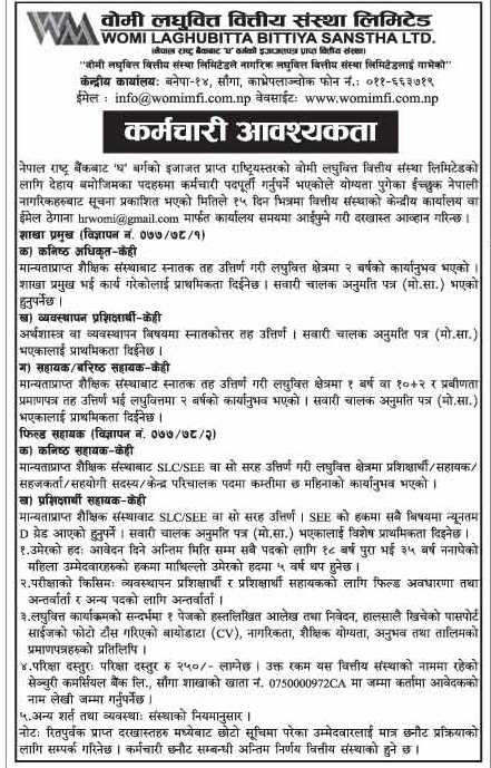 काठमाडौँ । वोमी लघुवित्त वित्तीय संस्था लिमिटेडले विभिन्न पदका लागि कर्मचारीको माग गरेको छ । संस्थाले कनिष्ठ अधिकृतका लागि केही, व्यवस्थापन प्रशिक्षार्थीका लागि केही, वरिष्ठ सहायकका लागि केही, फिल्ड सहायकका लागि केही र प्रशिक्षार्थीका लागि केही संख्यामा कर्मचारीको माग गरेको छ ।