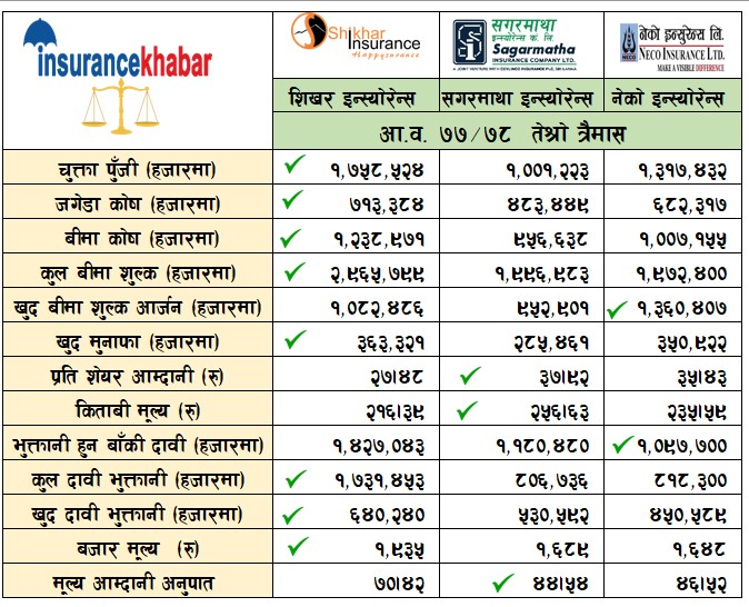शिखर इन्स्योरेन्सले चालु आर्थिक वर्षको तेश्रो त्रैमास सम्म ३६ करोड ३३ लाख खुद नाफा गरेको छ भने नेको इन्स्योरेन्सले ३५ करोड ०९ लाख खुद नाफा गर्दा सगरमाथा इन्स्योरेन्सले भने २८ करोड ५४ लाख खुद नाफा गरेको छ।