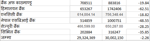 काठमाडौं दोस्रो बजारमा सूचिकृत २६ बाणिज्य बैंकहरुको नाफामा २ दशमलब २६ प्रतिशतले गिरावट आएको छ। कोभिड १९ का कारण खराव कर्जा बढ्दा बैंकहरुको मुनाफामा गिरावट आएको हो। कर्जा तथा निक्षेपमा सुधार देखिए पनि खराव कर्जा बढ्दा मुनाफामा भारि गिरावट देखिएको हो। चालु आर्थिक वर्ष २०७७/७८ को ६ महिनामा २६ बाणिज्य बैंकहरुले २९ अर्ब ३२ करोड रुपैयाँ नाफा आर्जन गरेका छन्। गत वर्षको यहि अवधिमा बैंकहरुको मुनाफा ३० अर्ब रुपैयाँ थियो।