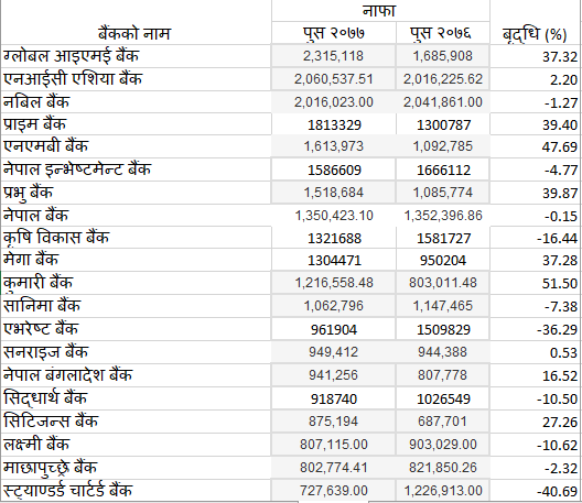 जनता बैंकलाई प्राप्ती गरेको ग्लोबल आइएमई बैंकले सबैभन्दा धेरै नाफा आर्जन गरेको छ। पुँजीका हिसावले सबैभन्दा ठुलो ग्लोबल आइएमई यस त्रैमाशिक अवधिमा नाफामा पनि एक नम्बरमा आएको छ। बैंकले ६ महिनाको अवधिमा २ अर्ब ३१ करोड रुपैयाँ मुनाफा आर्जन गरेको छ। दोस्रो नम्बरमा एनआईसी एशिया रहेको छ। बैंकले २.२० प्रतिशतले नाफा बढाएर २ अर्ब ६ करोड रुपैयाँ नाफा आर्जन गरेको छ।