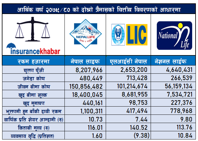 काठमाडौं । नेपाल लाइफ इन्स्योरेन्स, नेशनल लाइफ इन्स्योरेन्स र लाइफ इन्स्योरेन्स कर्पोरेशन नेपाल (एलआईसी नेपाल) नेपालमा स्थापित र तीन ठूला जीवन बीमा कम्पनीमा पर्दछन । तीन कम्पनीहरुले आर्थिक वर्ष ७९/८० को दोश्रो त्रैमासको (६ महिना) वित्तीय विवरण सार्वजनिक गरेको अवस्था छ । नेपाल लाइफ इन्स्योरेन्स, नेशनल लाइफ इन्स्योरेन्स र लाईफ इन्स्योरेन्स कर्पोरेशन नेपाल कम्पनीलाई इन्स्योरेन्स खबर टिमले गरेको तुलनात्मक अध्ययन :