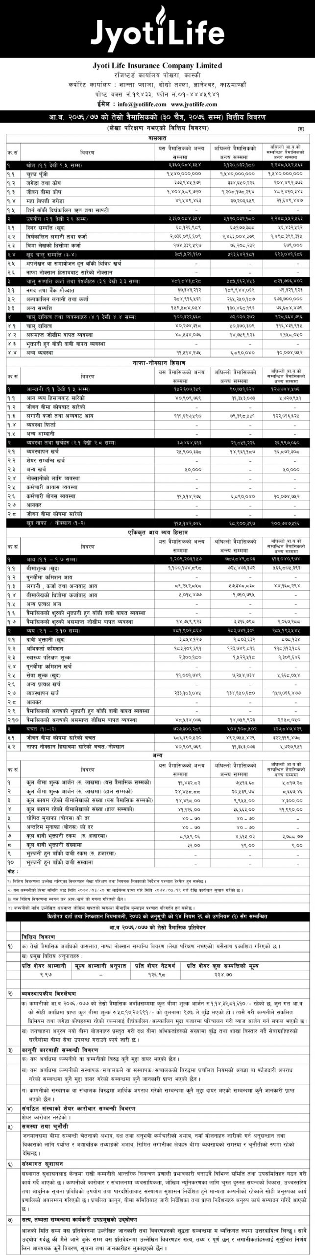लकडाउनको अवधिमा नै ज्योति लाईफ इन्स्योरेन्सले चालु आ.व.को तेश्रो त्रैमासको वित्तीय विवरण प्रकाशन गरेको छ । कम्पनीद्वारा प्रकाशित वित्तीय विवरण अनुसार गत आर्थिक वर्ष सोही अवधिको तुलनामा यस आर्थिक वर्षको तेश्रो त्रैमासमा कुल बीमा शुल्कमा ९७ प्रतिशतले वृद्धी गर्दै रु. १.१४ अर्ब आर्जन गर्न सफल भएको देखिन्छ ।