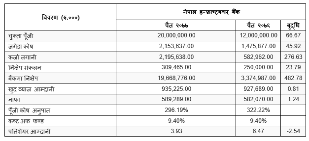 प्राथमिक शेयर निष्काशन पछि बैंकको चुक्ता पूँजी २० अर्ब रुपैयाँ पुगेको छ भने जगेडा कोषमा २ अर्ब १५ करोड रुपैयाँ जम्मा भएको छ । बैंकको आम्दानीको प्रमुख स्रोत व्याज आम्दानी थोरैले मात्रै बढेको छ । बैंक तथा वित्तीय संस्थाले व्याजदर घटाउदा बैंकको आम्दानी प्रभावित भएको हो । यस्तो आम्दानी ९३ करोड ५२ लाख रुपैयाँ मात्रै छ । पूँजी बृद्धि सँगै प्रतिशेयर आम्दानी ६ रुपैयाँबाट खुम्चिएर तीन रुपैयाँमा झरेको छ ।