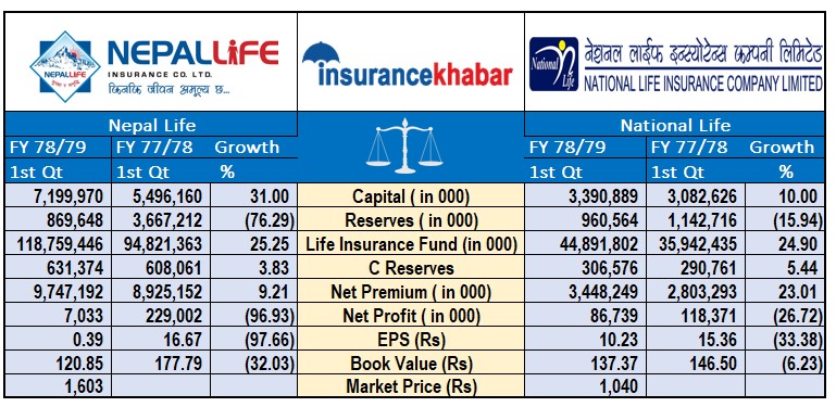 नेपाल लाईफ विगत लामो समय देखि एक नम्बरको जीवन बीमा कम्पनी रहँदै आएको छ भने केही समय यता नेशनल लाइफ आक्रामक रुपमा व्यापार गर्दै आएको छ । दुई जीवन बीमा कम्पनीले आर्थिक वर्ष ७८/७९ को प्रथम त्रैमासको वित्तिय विवरण सार्वजनिक गरेको छन् । दुई कम्पनी हेर्दा नेपाल लाइफको व्यवसाय ठूलो छ भने नेशनल लाइफको व्यवसाय वृद्धि दर राम्रो देखिन्छ। दुई जीवन बीमा कम्पनीलाई दाँजेर हेर्दा :