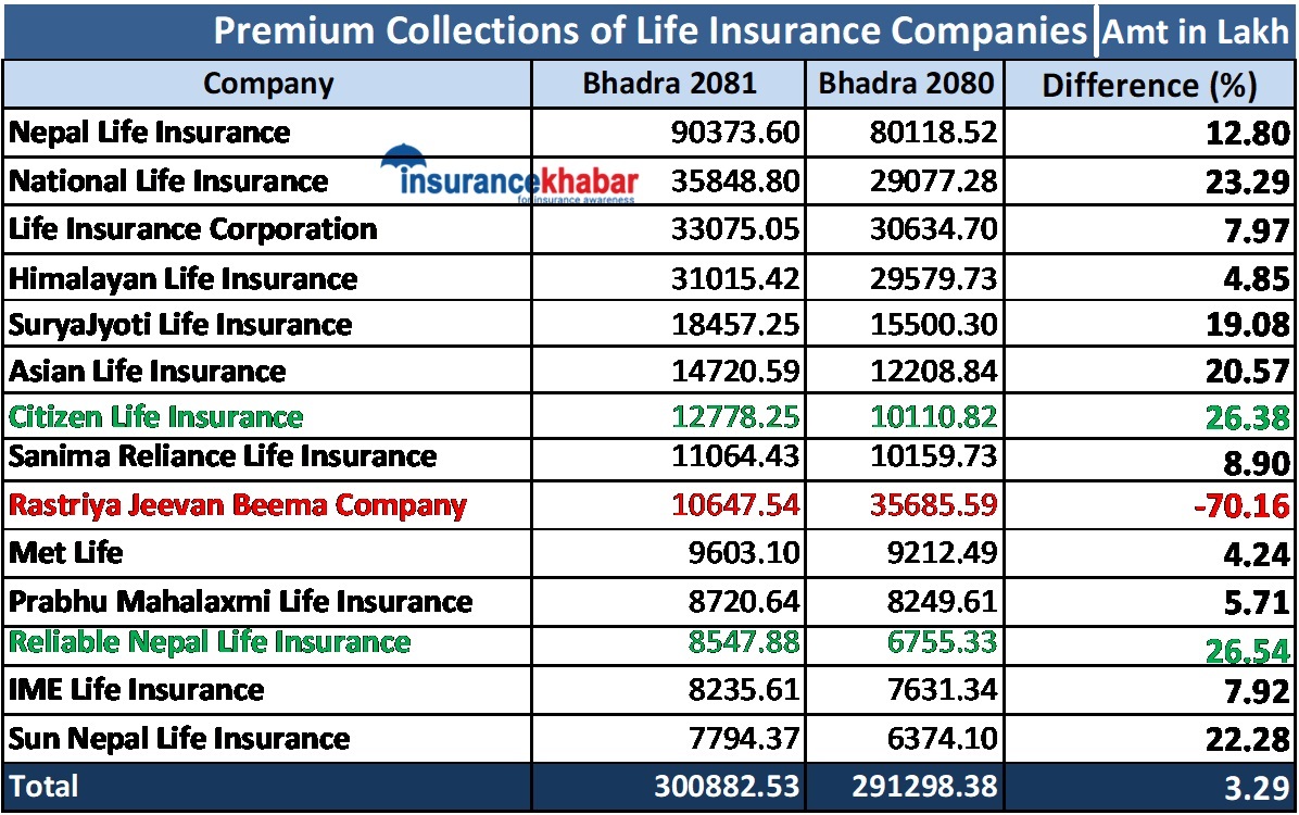 चालु आर्थिक वर्षको भदौसम्म लाइफ इन्स्योरेन्स कर्पोरेसनले ३ अर्ब ३० करोड ७५ लाख रुपैयाँ र हिमालयन लाइफले ३ अर्ब १० करोड १५ लाख रुपैयाँ कुल बीमाशुल्क आर्जन गरेका छन्। अघिल्लो वर्ष यही अवधिसम्म यी कम्पनीहरुले क्रमशः ३ अर्ब ६ करोड ३४ लाख रुपैयाँ र २ अर्ब ९५ करोड ७९ लाख रुपैयाँ कुल बीमाशुल्क आर्जन गरेका थिए।