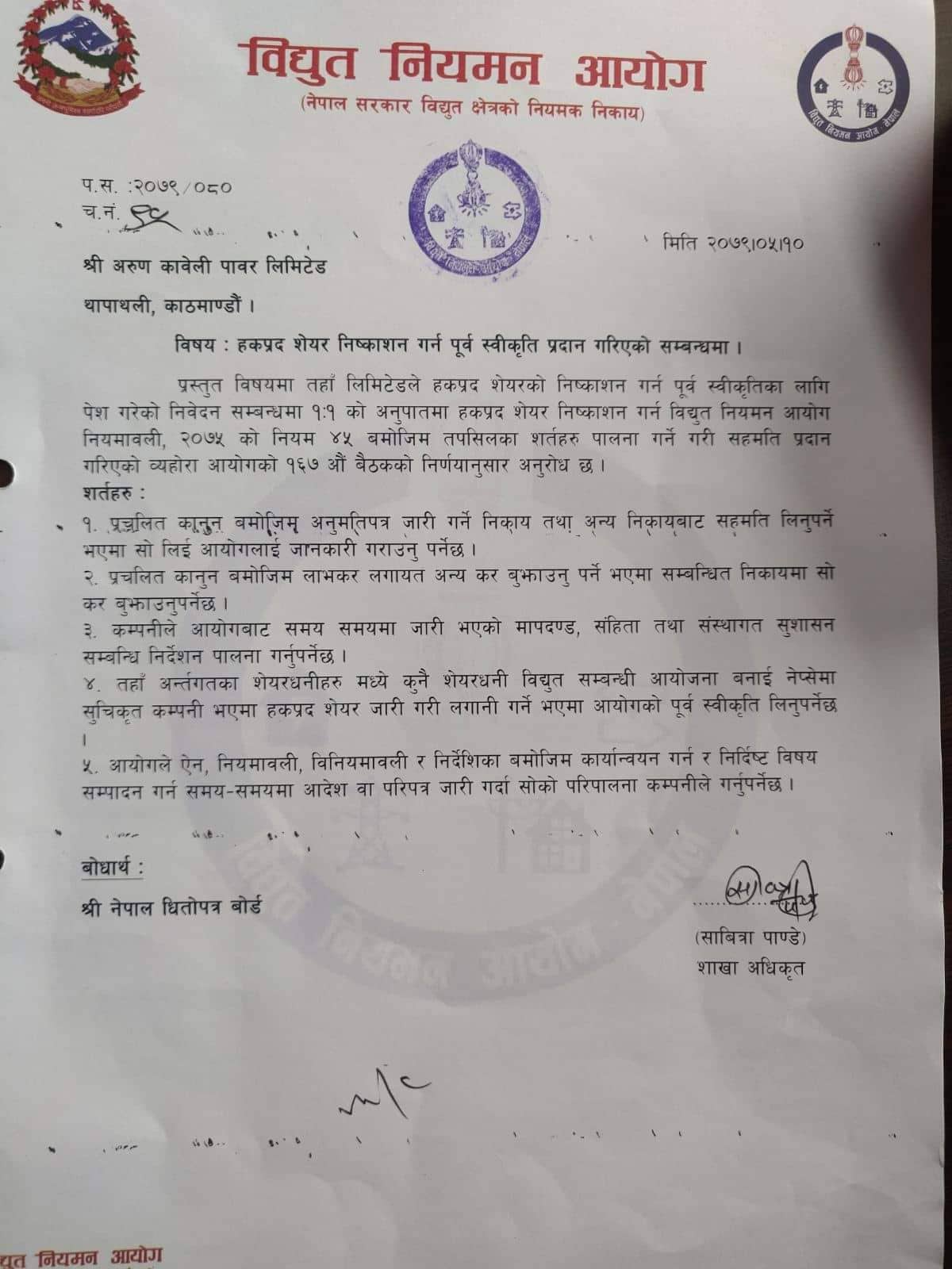 काठमाडौं । अरुण कावेली पावरले निष्काशन गर्न लागेको १०० प्रतिशत हकप्रद शेयरलाई विद्युत नियमन आयोगले अनुमति दिएको छ । नियमनले कम्पनीको उक्त प्रस्तावित हकप्रद शेयरलाई निष्काशन गर्न स्वीकृति प्रदान गरेको हो । हकप्रद शेयर निष्काशन गर्नुअघि आयोगको पुर्व स्वीकृति लिनुपर्ने हुन्छ सोही अनुरुप कम्पनीले पेश गरेको निवेदनलाई आयोगले स्वीकृति प्रदान गरेको हो । आयोगले कम्पनीलाई विभिन्न नियम तथा शर्तहरु पुरा गरी हकप्रद निष्काशन गर्न सहमति प्रदान गरेको जनाएको छ ।