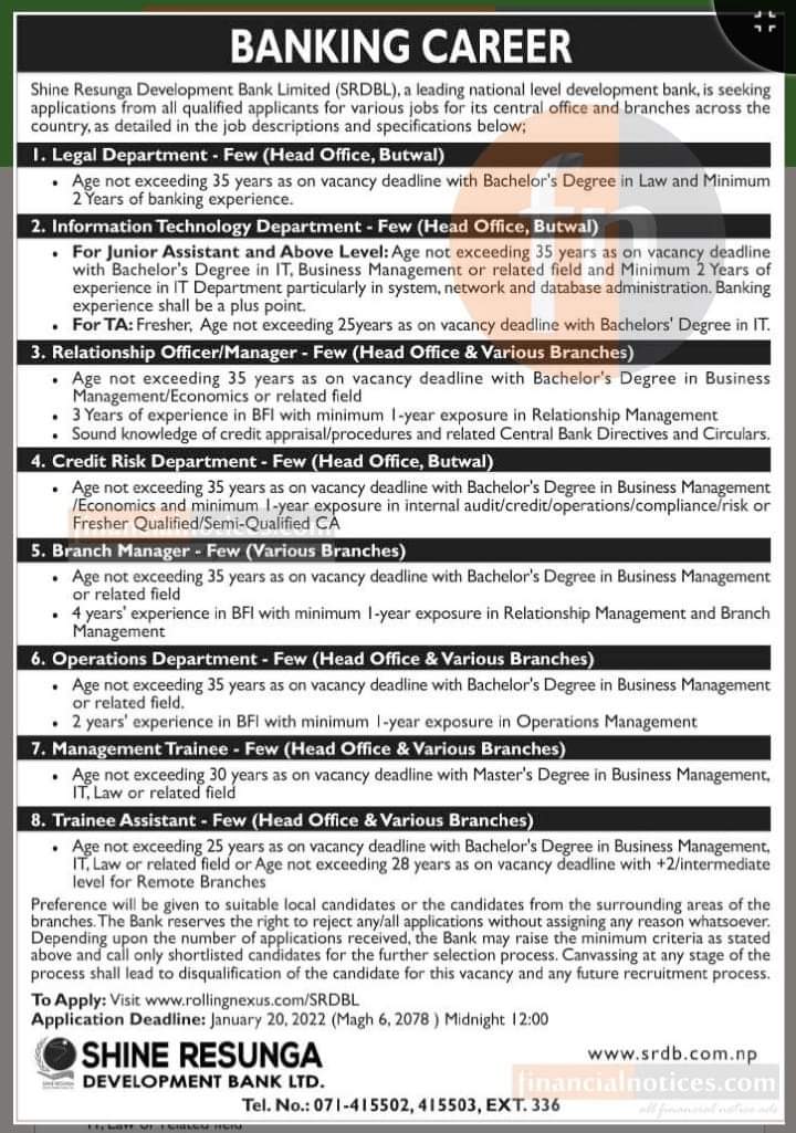 काठमाडौं । शाइन रेसुङगा डेभलपमेन्ट बैंकले विभिन्न पदका लागि कर्मचारीको माग गरेको छ । कम्पनीले लेगल डिपार्टमेन्टका लागि केही, इन्फरमेशन टेक्नोलोजी डिपार्टका लागि केही,रिलेशनसिप अफिसर र म्यानेजरका लागि केही, क्रेडिट रिक्स डिपार्टमेन्टका लागि केही, ब्रान्च म्यानेजरका लागि केही, अपरेशन डिपार्टमेन्टका लागि केही, म्यानेजमेन्ट ट्रेनीका लागि केही र ट्रेनी असिस्टेन्टका लागि केही संख्यामा कर्मचारीको माग गरेको हो ।