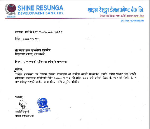 काठमाडौं । शाइन रेसुङ्गा डेभलपमेण्ट बैंककोे संचालक शर्मिला श्रेष्ठले सञ्चालक समिति सदस्यबाट दिएको राजिनामा स्वीकृत गरेको छ । कम्पनीको चैत १३ गते बसेको सञ्चालक समितिको बैठकले उनको राजिनामा स्वीकृत गरेको हो ।