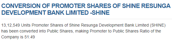 काठमाडौं । शाइन रेसुङ्गा डेभलपमेण्ट बैंकको संस्थापक शेयर सर्वसाधारण शेयरमा परिणत भएको छ । कम्पनीको १३ लाख १२ हजार ५४९ कित्ता संस्थापक शेयर सर्वसाधारण शेयरमा परिणत भएको हो ।