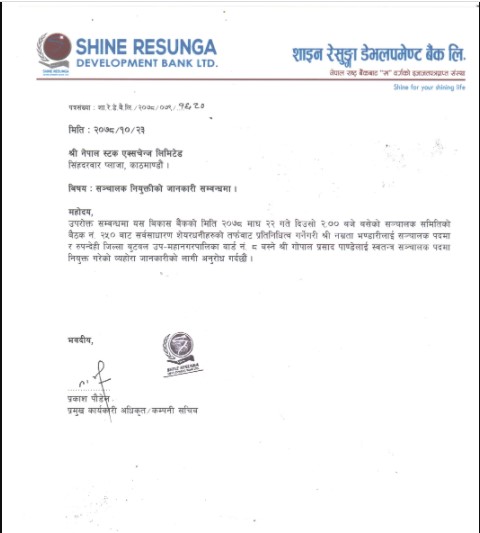 काठमाडौं । शाइन रेसुङ्गा डेभलपमेण्ट बैंकको सञ्चालकमा नम्रता भण्डारी नियुक्त भएकी छिन् । कम्पनीको माघ २२ गते बसेको सञ्चालक समितिको बैठकले सर्वसाधारण शेयरधनीको तर्फबाट भण्डारीलाई नियुक्त गरेको नेहो ।