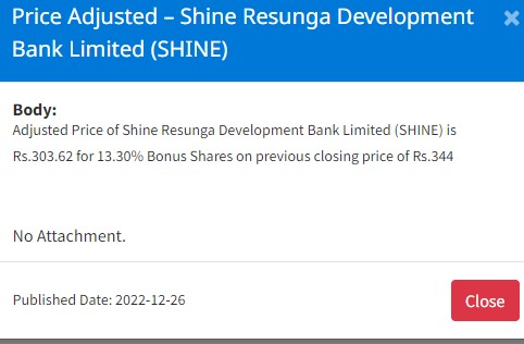 कम्पनीको आज अन्तिम शेयर मुल्य ३४४ रुपैयाँका आधारमा नेप्सेले बोनश शेयर वितरण पछिको शेयर मूल्य ३०३ रुपैयाँ ६२ पैसा कायम गरेको छ । सोही मूल्यको आधारमा अब शेयर कारोबार हुनेछ ।