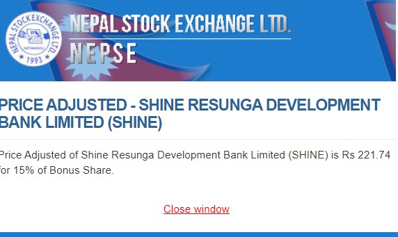 काठमाडौं । नेपाल स्टक एक्सचेन्ज (नेप्से) मा आज शाइन रेसुङ्गा डेभलपमेन्ट बैंकको बोनस शेयरपछिको मूल्य समायोजन भएको छ ।नेप्सेमा बैंकको १५ प्रतिशत बोनस शेयरपश्चात् प्रतिकित्ता २२१ रुपैयाँ ७४ पैसा कायम हुने गरी शेयर मूल्य समायोजन भएको छ ।
