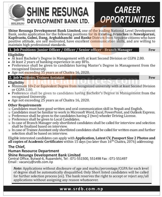 काठमाडौं । शाइन रेसुङ्गा डेभलपमेन्ट बैंकले विभिन्न पदको लागि कर्मचारी माग गरेको छ । बैंकले एक सूचना जारी गर्दे जुनियर अफिसर, अफिसर, सिनियर अफिसर ब्रान्च म्यानेनजर र ट्रेनि अस्सिटेन पदको लागि कर्मचारी माग गरेको हो ।