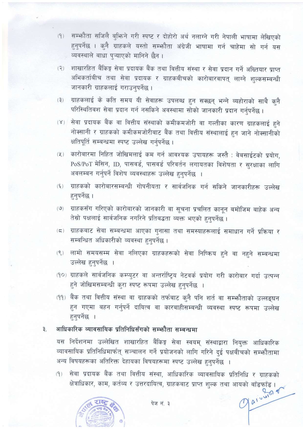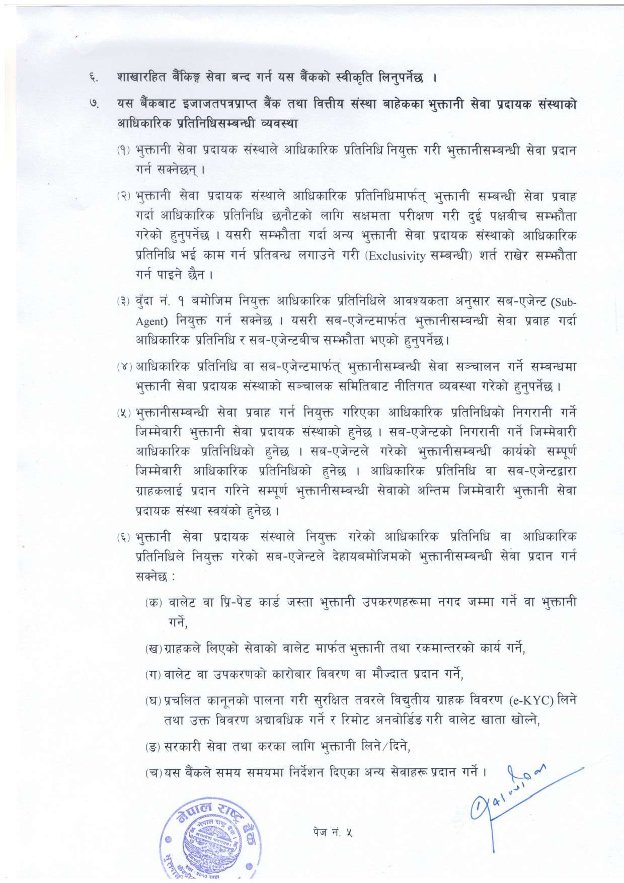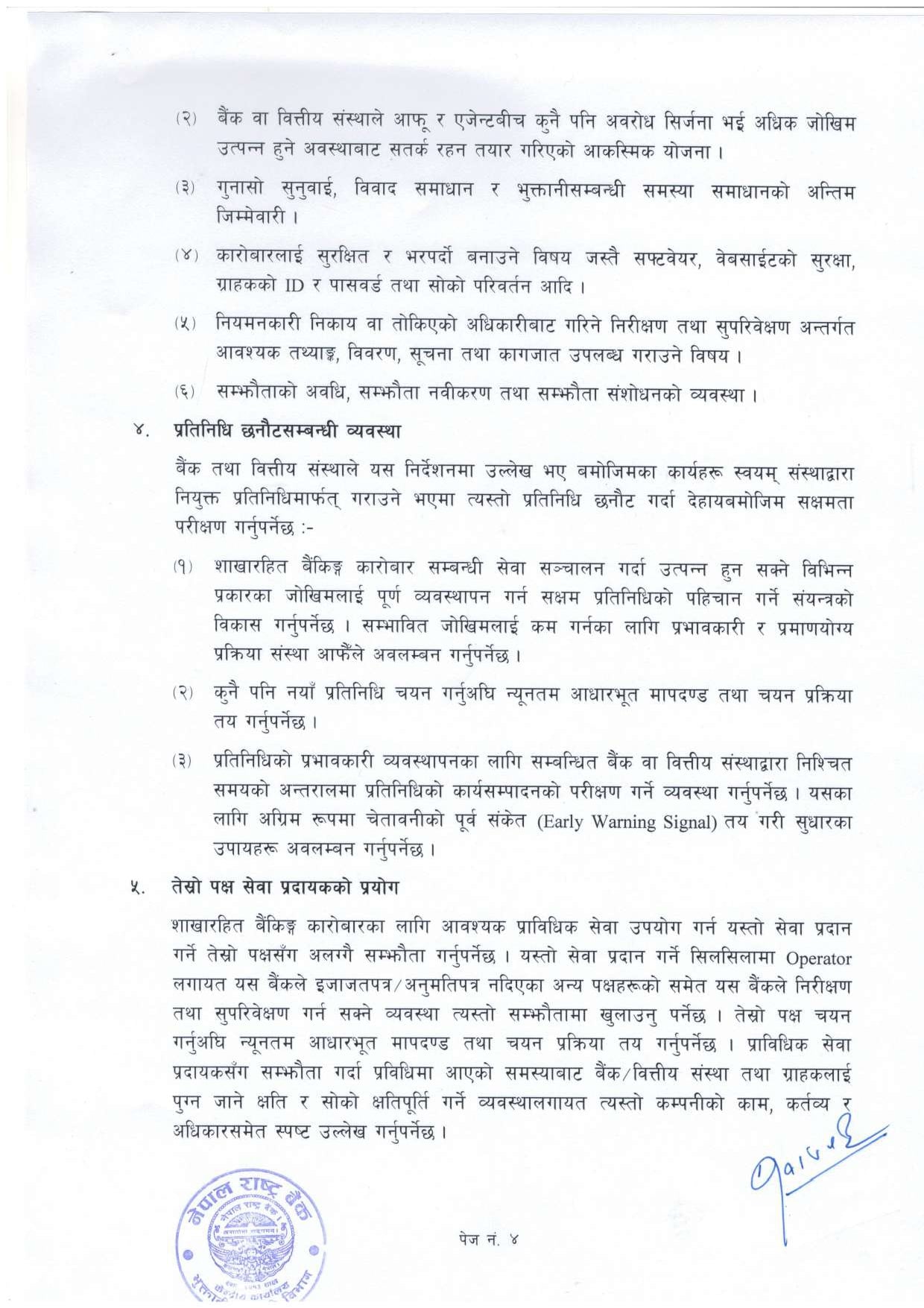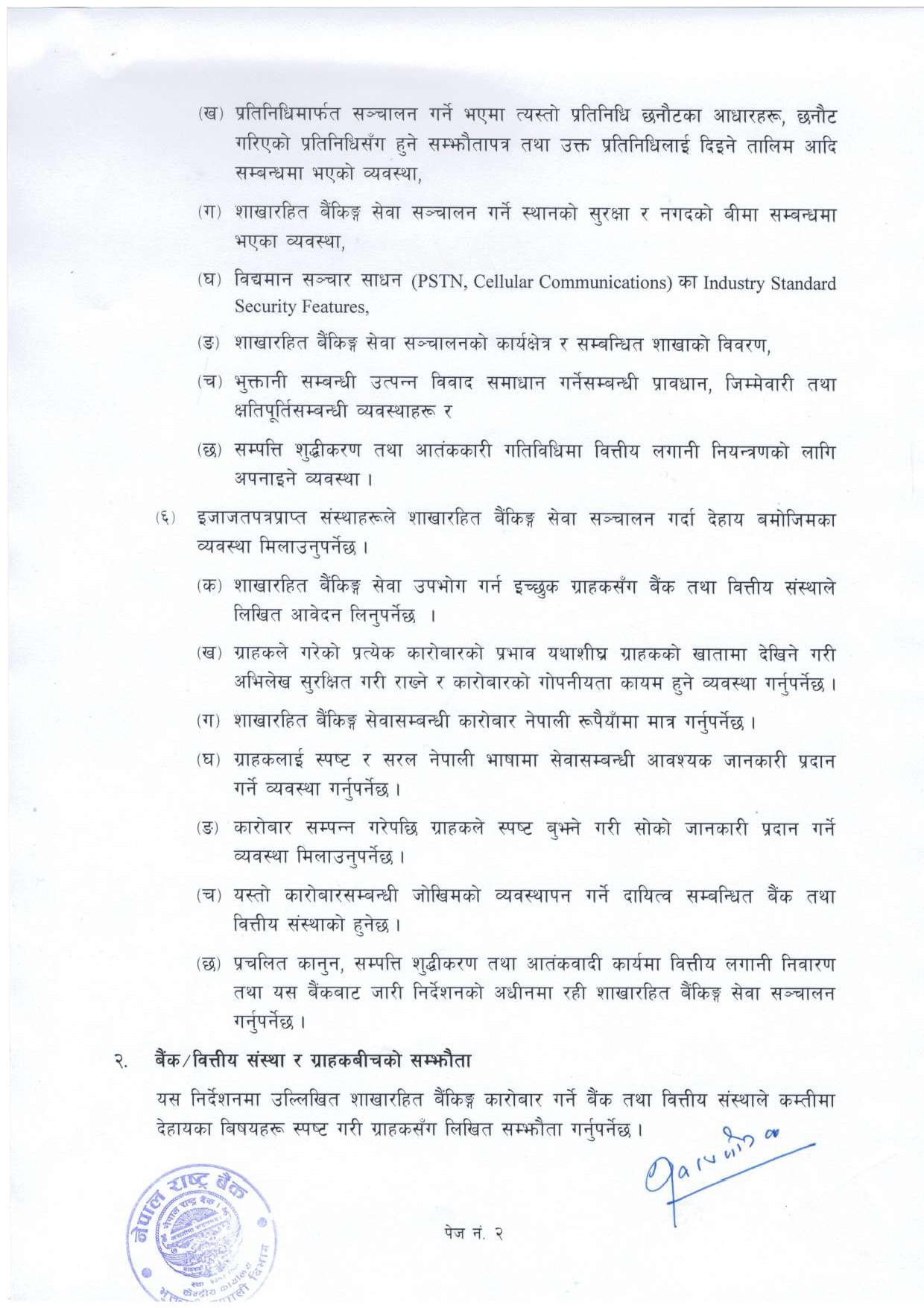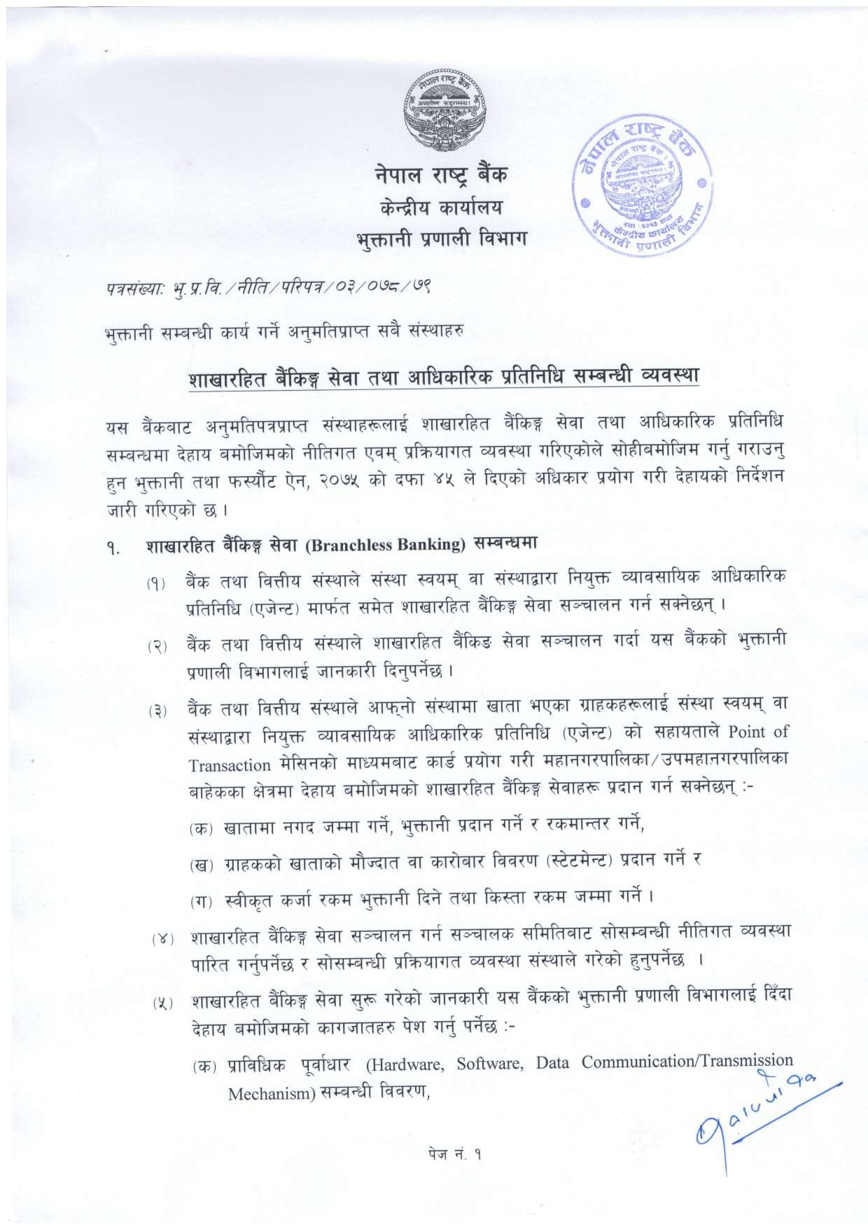 बैंक तथा वित्तीय संस्थाले शाखा रहित बैंक सेवाका लागि स्वयम् वा आधिकारिक प्रतिनिधि एजेन्ट खटाउने पाउने भएका छन् । बैंक तथा वित्तीय संस्थाले शाखा रहित बैंकिङ सेवा सञ्चालन गर्दा यस बैंकको भुक्तानी प्रणाली विभागलाई जानकारी दिनुपर्नेछ । बैंकहरुले यस्तो सेवा उप महानगर तथा महानगरपालिका बाहेकका स्थानीय तहमा मात्रै प्रवाह गर्न पाउने छन् ।
