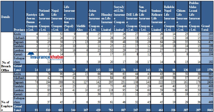 यसैगरी देशभर सानिमा रिलायन्सको १७०, आइएमई लाइफको १४४, सन नेपाल लाइफ १४१, सिटिजन लाइफको १३६, एसियन लाइफको १३२, नेसनल लाइफ र प्रभु महालक्ष्मी लाइफको समान ११५, रिलायबल नेपाल लाइफको ९६, लाइफ इन्स्योरेन्स कर्पोरेसनको ७७ र मेट लाइफको ३५ वटा शाखा छन्।