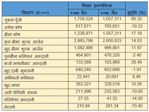 कर्जा लगानीबाट कम्पनीले यस वर्ष १३ करोड ३५ लाख रुपैयाँ आर्जन गरेको छ । कम्पनीको चुक्ता पूँजी ६६ प्रतिशलते बढेर एक अर्ब ७५ करोड रुपैयाँ पुगेको छ । त्यस्तै जगेडा कोषमा ६१ करोड ७६ लाख रुपैयाँ जम्मा भएको छ । कम्पनीको बीमा कोष थप १७ प्रतिशतले बढेर एक अर्ब २३ करोड रुपैयाँको भएको छ । पूँजी बढे सँगै प्रतिशेयर आम्दानी भने १४ रुपैयाँले घटेर २७ रुपैयाँमा खुम्चिएको छ ।