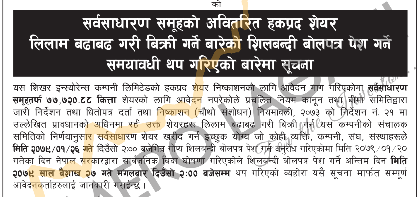 काठमाडौं । शिखर इन्स्योरेन्स कम्पनी लिमिटेडको लिलामी शेयरमा आवेदन दिने समयावधि थप भएको छ । लिलामी शेयरमा आवेदन दिने अन्तिम दिन आज भएपछि बैशाख २० गते ईद पर्वको अवसरमा सरकारले सार्वजनिक बिदा दिएकोले उक्त मिति लम्ब्याएर अब बैशाख २७ गतेसम्म बोलपत्र पेश गर्न सकिनेछ ।