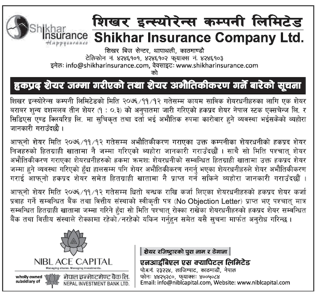 शिखर इन्स्योरेन्सको हकप्रद शेयरधनीको हितग्राही खातामा जम्मा