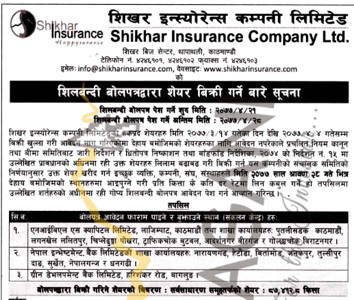 काठमाडौं । शिखर इन्स्योरेन्स कम्पनीले ८७ हजार ४१२ कित्ता शेयर लिलामी गर्ने भएको छ । कम्पनीले गत असार १४ गतेदेखि साउन ४ गतेसम्म हकप्रद बिक्री खुला गरी आवेदन माग गरिएकोमा सोही अवधिसम्म देहाय बमोजिम आवेदन नपरेकाले उक्त शेयर लिलामी मार्फत विक्री गर्न लागेको हो ।