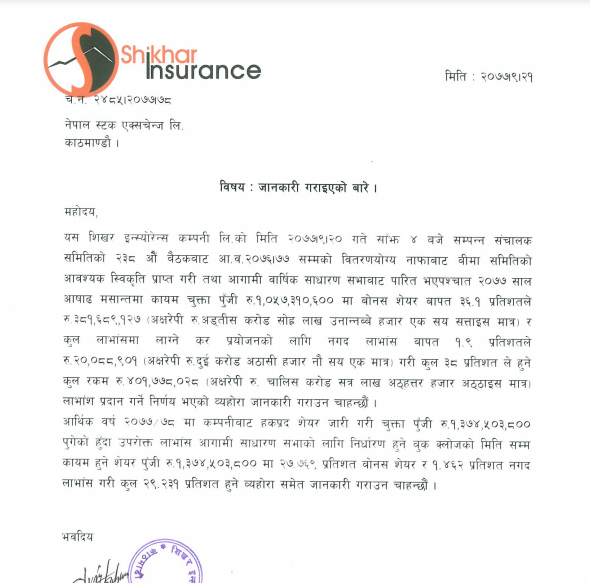 शिखर इन्स्योरेन्सद्धारा लाभांश प्रस्ताव