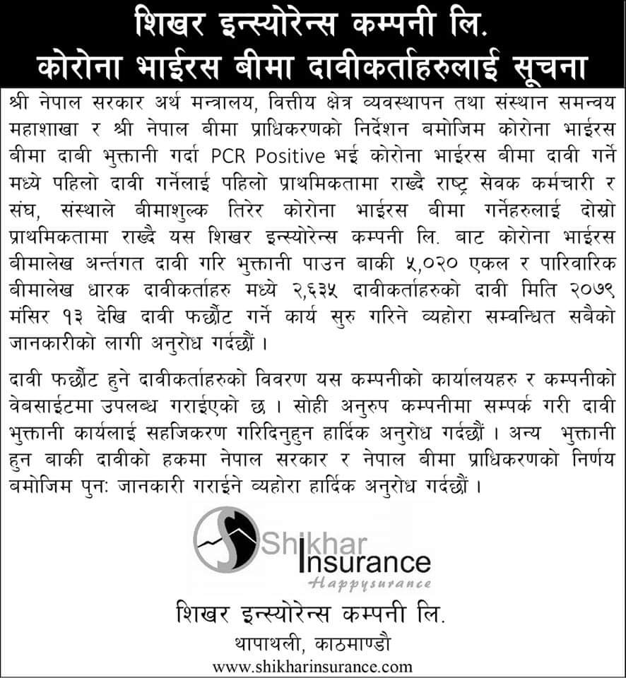 काठमाडौं। शिखर इन्स्योरेन्स कम्पनीले कोरोना बीमा खरिद गरेका आफ्ना बीमितलाई मंगलबार देखि प्राथमिकताको आधारमा दाबी भुक्तानी शुरु गरेको छ। कम्पनीले सार्वजनिक सूचना प्रकाशन गर्दै पिसिआर पोजिटिभ भई बीमा दाबी गर्ने मध्ये पहिलो दाबी गर्नेलाई पहिलो प्राथमिकतामा राखेर दाबी रकमको भुक्तानी शुरु गरिएको जानकारी दिएको छ।