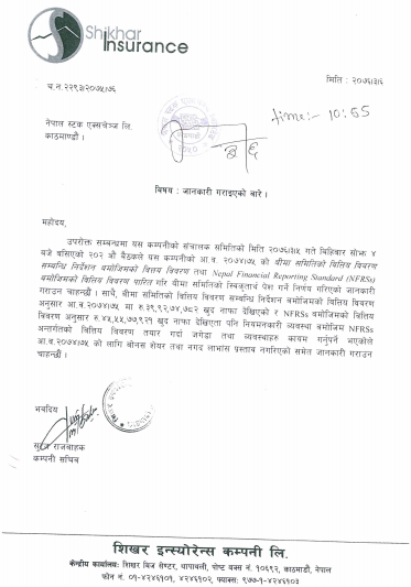 असार ५ गते बसेको कम्पनी संचालक समितिको बैठकले आर्थिक वर्ष २०७४ ७५ को बीमा समितिको वित्तीय विवरण सम्बन्धि निर्देशन बमोजिमको वित्तीय विवरण तथा नेपाल फाइनान्सियल रिपोर्टिङ स्टान्डर्ड बमोजिमको वित्तीय विवरण पारित गरी बीमा समितिको स्विकृतार्थ पेश गर्ने निर्णय गरेको छ ।