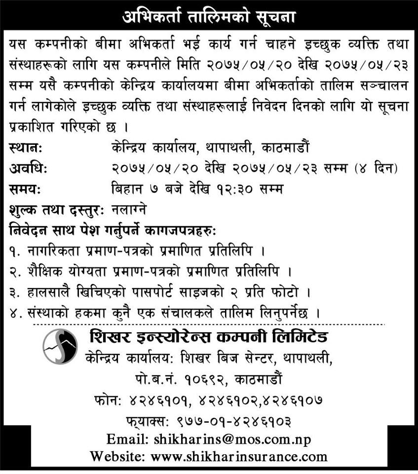 निर्जिबन बीमा ब्यबसायको लागि अग्रणी बीमा कम्पनी शिखर इन्स्योरेन्सले निर्जिबन बीमा क्षेत्रमा अभिकर्ता भई कार्य गर्न चाहने इच्छुक व्यक्ति तथा संस्थाका लागि बीमा अभिकर्ता तालिम सञ्चालनमा गर्ने भएको छ ।