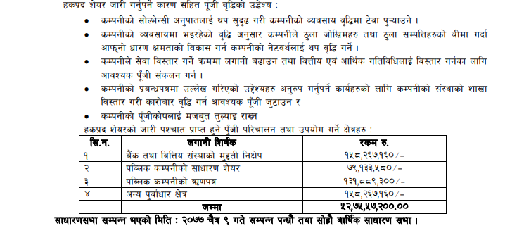 कम्पनीले सोल्भेन्सी अनुपातलाई थप सुदृढ गरी कम्पनीको व्यवसाय वृद्धिमा टेवा पुर्याउन हकप्रद शेयर निष्काशन गर्न लागेको हो । कम्पनीको व्यवसायमा भइरहेको वृद्धि अनुसार कम्पनीले ठुला जोखिमहरु तथा ठुला सम्पत्तिहरुको बीमा गर्दा आफ्नो धारण क्षमताको विकास गर्न कम्पनीको नेटवर्थलाई थप वृद्धि गर्न हकप्रद शेयर निष्काशन गर्न लागेको हो ।