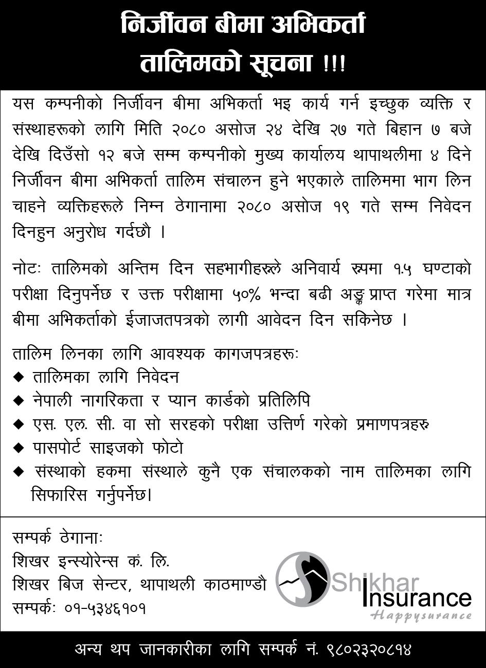 उक्त तालिममा सहभागी हुनका लागि असोज १९ गतेसम्म निवेदन दिनुपर्नेछ । तालिमको अन्तिम दिन सहभागीहरुले परीक्षा दिनुपर्नेछ । तालिमका लागि नेपाली नागरिकताको प्रतिलिपी, प्यान कार्ड, एसएलसी वा सो सरहको परीक्षा उर्तिण गरेको हुनुपर्नेछ । पासपोर्ट साइजको फोटो चाहिने कम्पनीले जनाएको छ । ईच्छुकले शिखर इन्योरेन्सको केन्द्रीय कार्यालय बिज सेन्टर थापाथलीमा सम्पर्क गर्नुपर्नेछ ।