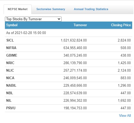 त्यस्तै, ग्लोबल आइएमई बैंक, नेपाल पुनर्बीमा, नेपाल लाइफ इन्स्योरेन्स, एनआइर्सी एशिया बैंक, नबिल बैंक, नेपाल बैंक, नेको इन्स्योरेन्स र प्रभु बैंकको सर्वाधिक कारोबार भएको छ।