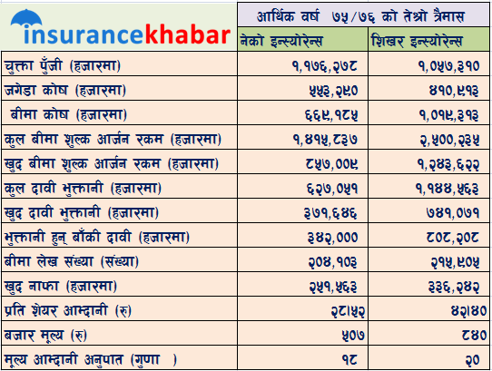 शिखर इन्स्योरेन्सले चालु आर्थिक वर्षको तेश्रो त्रैमास सम्म ३३ करोड ६२ लाख खुद नाफा गरेको छ भने नेको इन्स्योरेन्सले २५ करोड १५ लाख खुद नाफा गरेको छ।