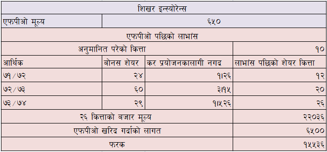 यसरी आजको दिन सम्म आउदा शिखर इन्स्योरेन्सको एफपीओमा १० कित्ता शेयर पार्ने लगानीकर्तालाई १५ हजार ५ सय ३५ रुपैया नाफा भएको देखिन्छ ।