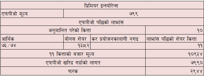 यसरी आजको दिन सम्म आउँदा प्रमियर र इन्स्योरेन्सको एफपीओमा १० कित्ता शेयर पार्ने लगानीकर्तालाई २ हजार ९ सय ४४ रुपैयाँ नाफा भएको देखिन्छ ।