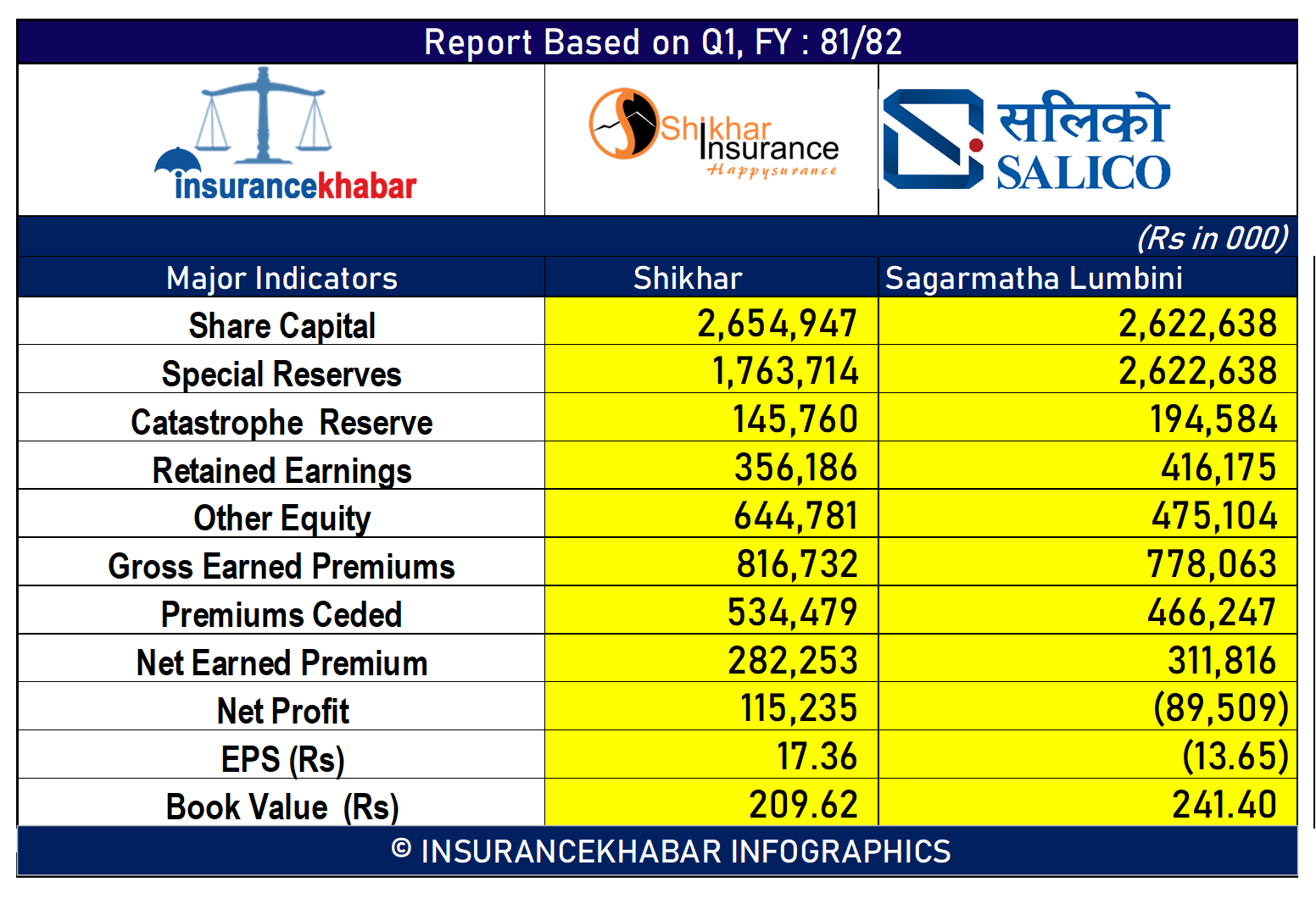 कुल बीमाशुल्क आर्जनः शिखर इन्स्योरेन्सले चालु आर्थिक वर्षको प्रथम त्रैमाससम्म ८१ करोड ६७ लाख कुल बीमाशुल्क आर्जन गरेको छ भने सगरमाथा लुम्बिनी इन्स्योरेन्सले ७७ करोड ८० लाख कुल बीमाशुल्क आर्जन गरेको छ।