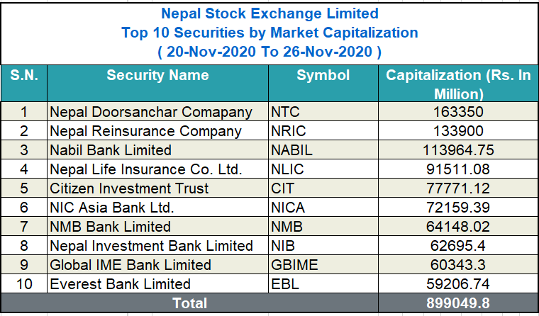 शेयर बजारमा चुक्ता पूँजी र शेयरमूल्य उच्च रहँदै गर्दा नेपाल टेलिकमले धेरैजसो समय आफुलाई पहिलो स्थानमा राख्दै गर्दा दोस्रो देखि दशौं स्थानमा भने हरेक साता ठूला कम्पनीहरुमा आउने उतार चढावका कारण परिवर्तन हुँदै आइरहेको छ ।