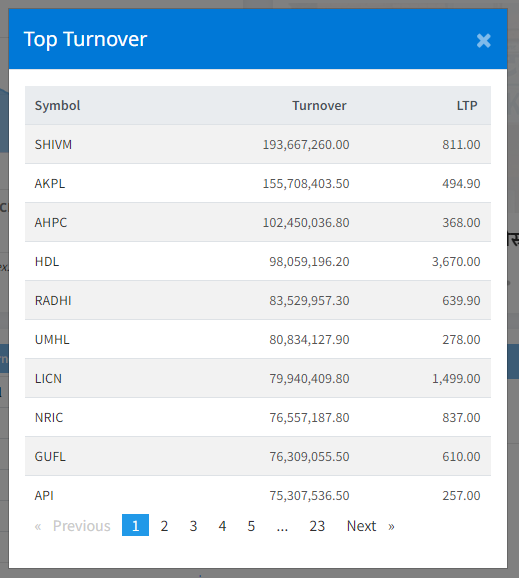 हिमालयन डिष्ट्रलरीको ९ करोड ८० लाख रुपैयाँको खरिद बिक्री भएको छ । त्यस्तै राधीको पनि ८ करोड, यनाइटेड मोदी को ८ करोड, लाइफ इन्स्योरेन्स कर्पोरेसनको ७ करोड ९९ लाख, नेपाल पुनर्बीमाको ७ करोड ६५ लाख, गोर्खाज फाइनान्सको ७ करोड ६३ लाख र अपि पावरको ७ करोड ५३ लाख रुपैयाँको खरिद बिक्री भएको छ ।