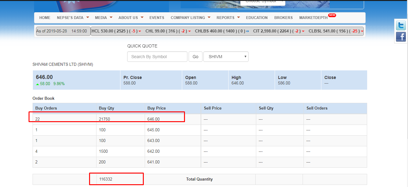 आज सवा २ बजे बाट शिवम सिमेण्ट्समा आक्रामक खरिद कर्ताको उपस्थिती थियो। अन्तिम समयमा खरिद कर्ता मात्र थिए। बजार बन्द हुँदाको बेला सर्किट लेभलमा ( ६४६ रुपैयामा ) २१ हजार ७ सय ५० कित्ता शेयर खरिकर्ता थिए।