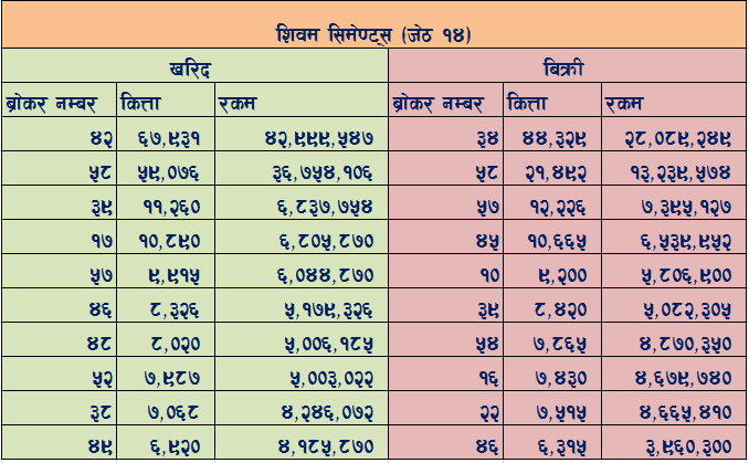 सिवम् सिमेन्टको अघिल्लो “बुल र्याली”मा ५८ नम्बर ब्रोकर निकै धेरै संलग्न भए पनि आजको कारोवार हेर्दा ४२ नम्बर ब्रोकरबाट निकै आक्रामक रुपमा शेयर खरीद गरेको देखिन्छ। आज ४२ नम्बर ब्रोकरबाट शिवम सिमेण्ट्सको सर्वाधिक ४ करोड २९ लाख बराबरको ६७ हजार ९ सय ३१ कित्ता शेयर खरीद भएको छ। सूचीको दोश्रोमा ५८ नम्बर ब्रोकर रहेको छ। ५८ नम्बर ब्रोकरबाट आज ३ करोड ६७ लाख बराबरको ५९ हजार ७६ कित्ता शेयर खरिद भएको छ।