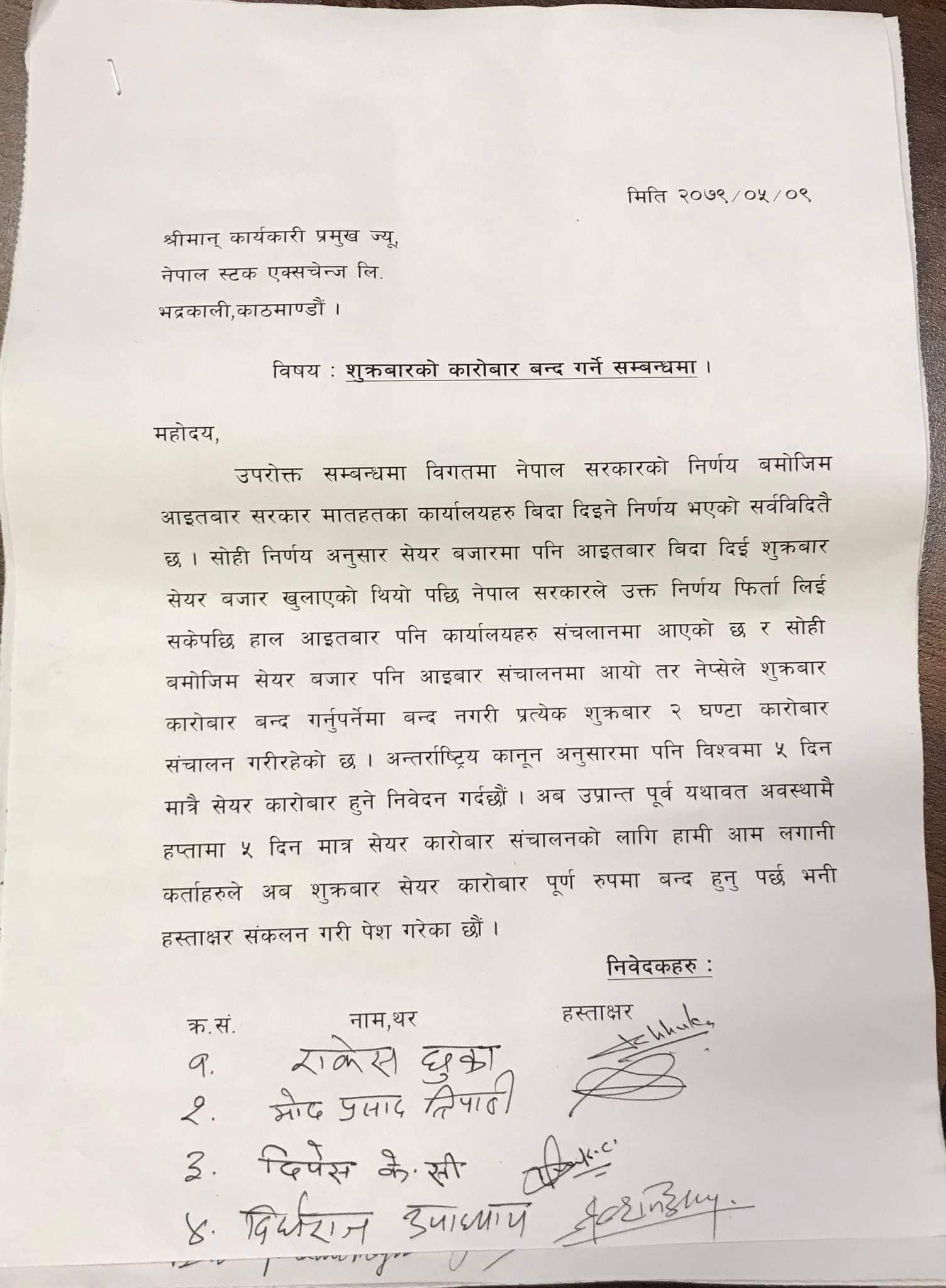 उनिहरुले सातामा ५ दिन मात्रै कारोबार हुनु पर्छ भन्दै हस्ताक्षर संकलन गरेका हुन् । उनिहरुले सिइओ कार्कीलाई संकलित हस्ताक्षर हस्तान्तरण गरेका छन् । पछिल्लो समय शेयर बजार लगातार तल झर्न थाले पनि लगानीकर्ताहरु कारोबार दिन छोट्याउनु पर्ने माग गरिरहेका छन् । बजार बढेको वेलामा कारोबार समय र दिन बढाउनु पर्ने माग राख्ने लगानीकर्ताहरुले बजार घट्दा कारोबार समय र दिनमा जहिले पनि प्रश्न गर्ने गरेका छन् ।