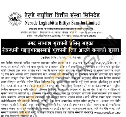 काठमाडौं । नेरुडे लघुवित्त वित्तीय संस्था लिमिटेडले पाँच वर्ष पुरानो नगद लाभांश नबुझेका शेयरधनीलाई यथाशीघ्र बुझ्न आग्रह गरेको छ ।कम्पनीले आर्थिक वर्ष २०६६/६७ देखि २०७२/७३ सम्मको नगद लाभांश बुझ्न सम्बन्धित शेयरधनीहरूलाई आग्रह गरेको हो ।