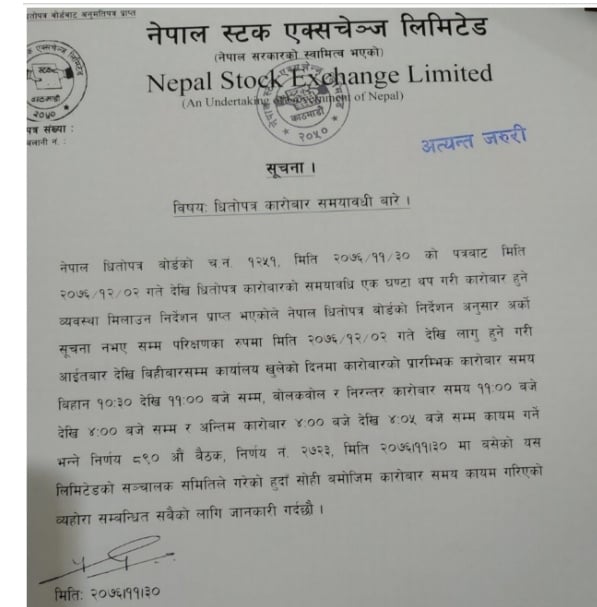 नेप्सेले शुक्रबार साँझ बढेको सञ्चालक समितिको निर्णय सार्वजनिक गर्दै धितोपत्र बोर्डको निर्देशन अनुसार अर्काे व्यवस्था नभएसम्मका लागि परिक्षणका रुपमा शेयर कारोबार दैनिक पाँच घण्टा विहान ११ः०० बजेदेखि १६ः०० बजेसम्म कायम गर्ने निर्णय गरेको जनाएको छ ।