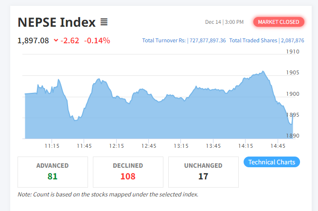 आज १०८ कम्पनीको शेयर मूल्यमा गिरावट आउदा ८१ वटाको सुधार भएको छ । हिजो मंगलबार सुधारदेखिएका सूचकमा आज गिरावट देखिन्छ । यसरी एक दिन सुधार भएका कम्पनी तथा सूचकमा भोलिपल्टै गिरावट हुने र गिरावट भएका सूचक तथा कम्पनीमा सुधार हुने अवस्थाले लगानीकर्ताको मनोबल गिराइरहेको छ ।