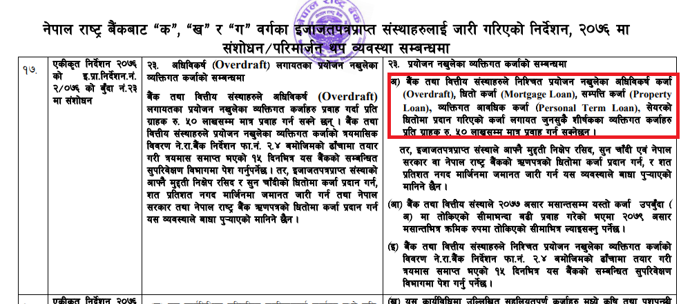 सो निर्देशनले प्रयोजन नखुलेका आवधिक ब्यक्तिगत कर्जाहरुको सवालमा ५० लाखको सिमा तोक्दै थप परिभाषित गरेको छ ।